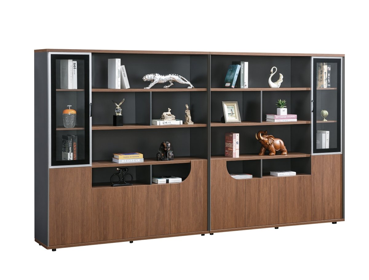This set of bookcases is made of dark wood and dark grey. The open shelves are used to display books and art pieces, creating a sense of depth and adding cultural charm. The closed cabinets are paired with vertical wood veneers, which focus the visual attention and balance openness and privacy. Whether it is a CEO’s office or a high-end business space, it presents a low-key yet luxurious texture, becoming the finishing touch that highlights taste and style. Each book and every collection can tell the owner’s aesthetic and style within the orderly arrangement.