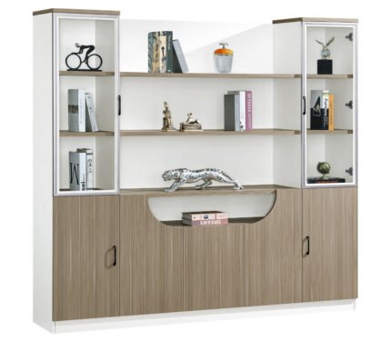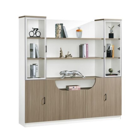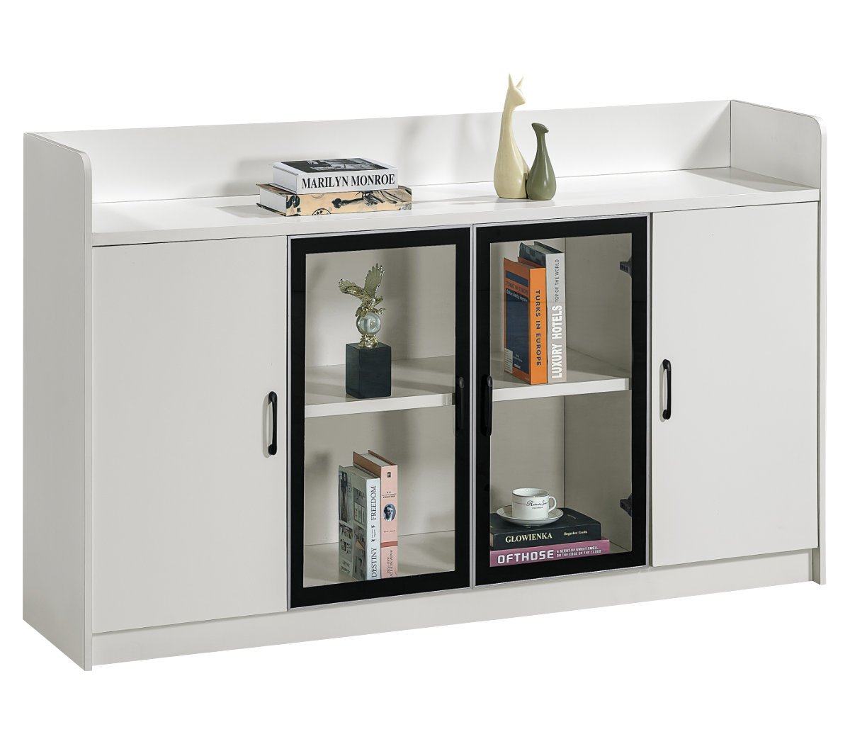 This modern white sideboard features a clean, minimalist design with a spacious top surface perfect for displaying decorative items. The centerpiece is two glass-paneled doors with sleek black frames, offering a clear view of the interior shelving which is ideal for showcasing books, collectibles, or stemware. Flanking the glass section are two solid cabinet doors, providing concealed storage for items you prefer to keep out of sight. Constructed from durable engineered wood, this versatile piece is perfect for a living room, dining room, or entryway, blending style with practical storage solutions.