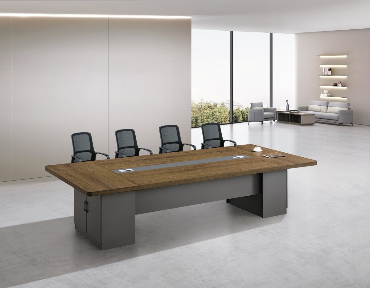 The overall design of the conference table is simple and modern. The table structure is spacious, capable of accommodating multiple people to sit at the same time, making it suitable for formal meetings, project discussions, or high-level decision-making scenarios.