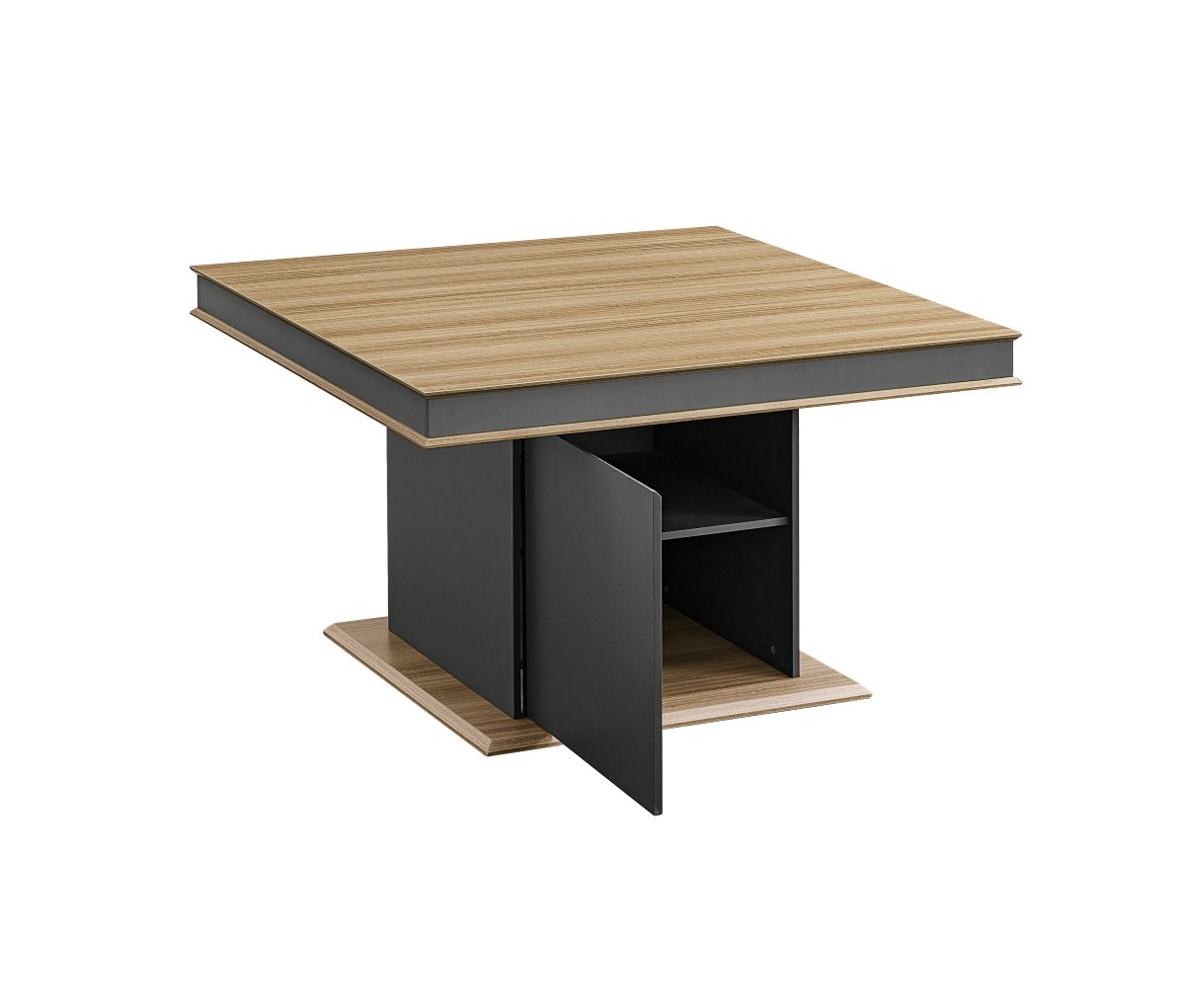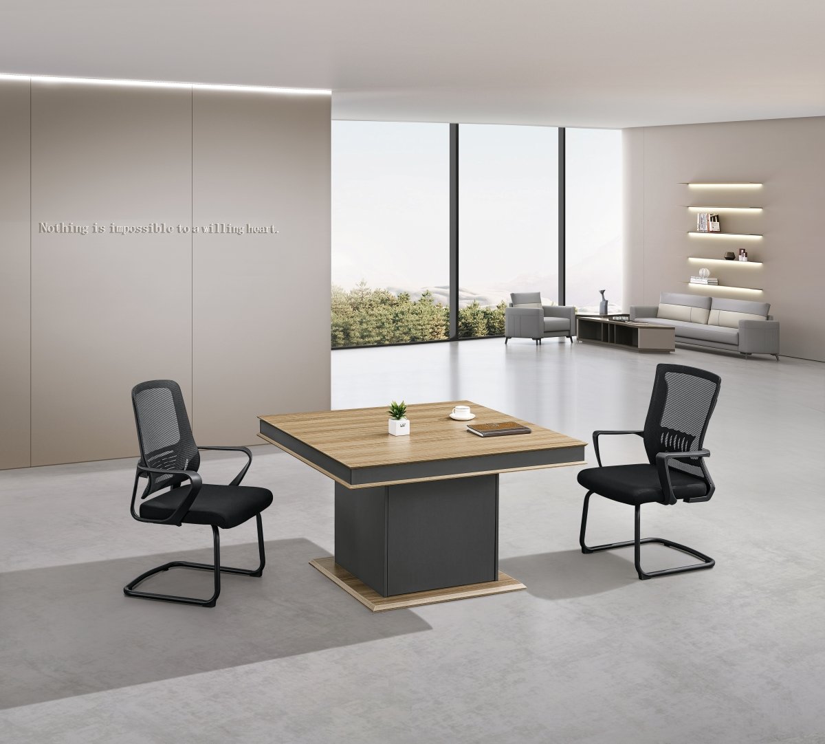 This is a square meeting table with a modern and simple design. The overall appearance features a contrasting color scheme of “wooden surface with dark columns”. The lines are sharp and the shape is stable. It is suitable for modern office reception spaces. The meeting table surface is light wood color, paired with dark gray column bases. This creates a sharp visual contrast, enhancing the spatial sense of depth and maintaining a fashionable look. Placing a small potted plant on the table adds a touch of naturalness, giving the overall style a simple yet warm feel.